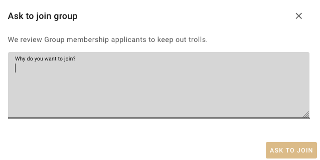 The next dialog appears after you have clicked the “Join Group” button previously. You will need to say something about why you would like to join. Then the button “asked to join” will become enabled. Click that button and then be patient for us to review your reason for wanting to join and responding to you.
